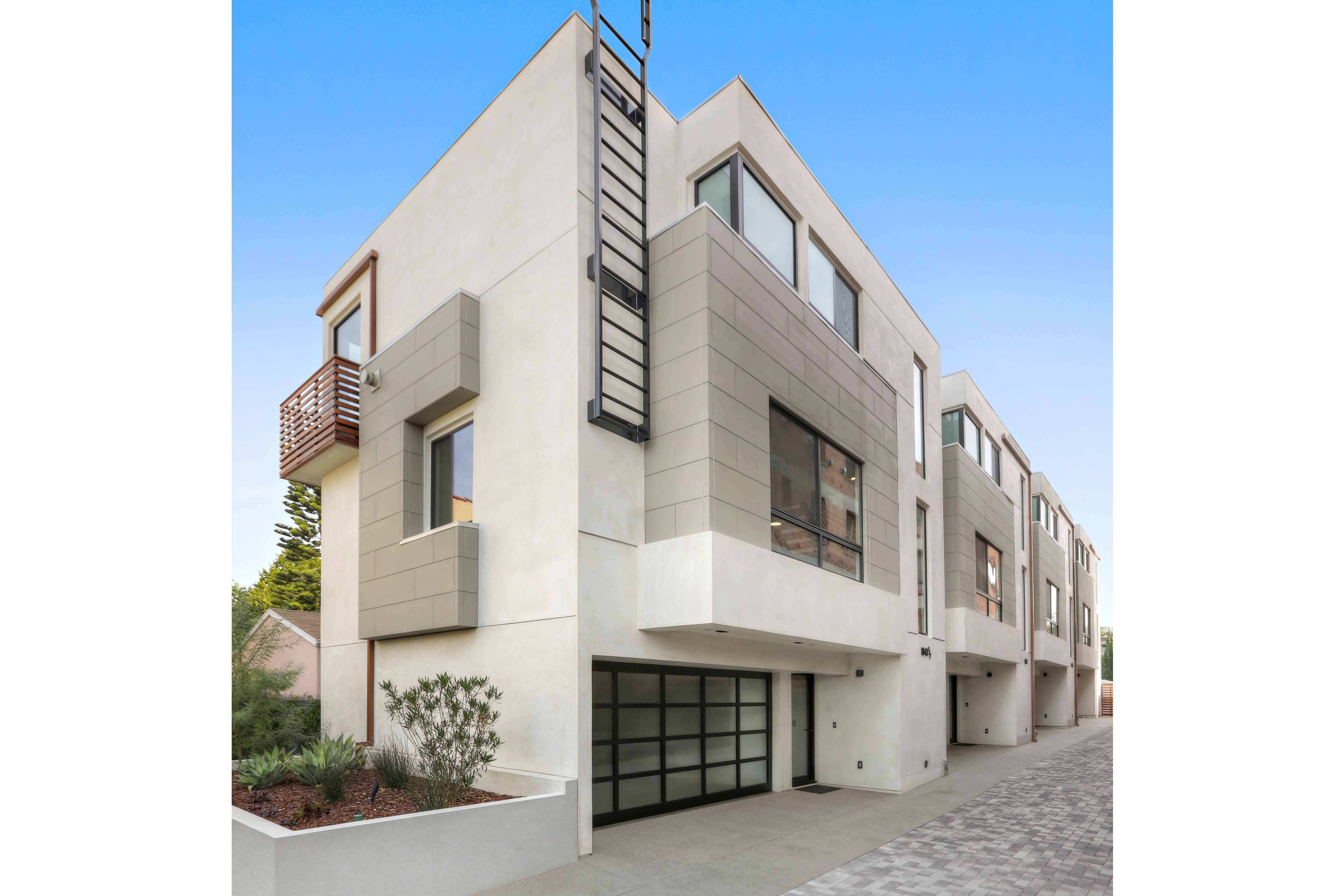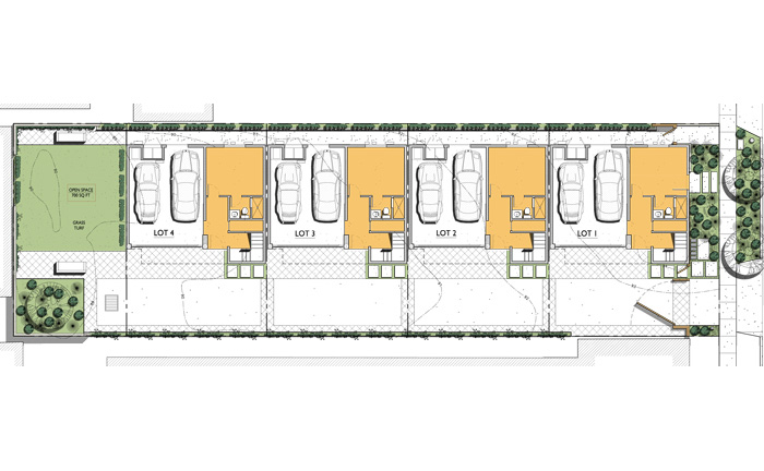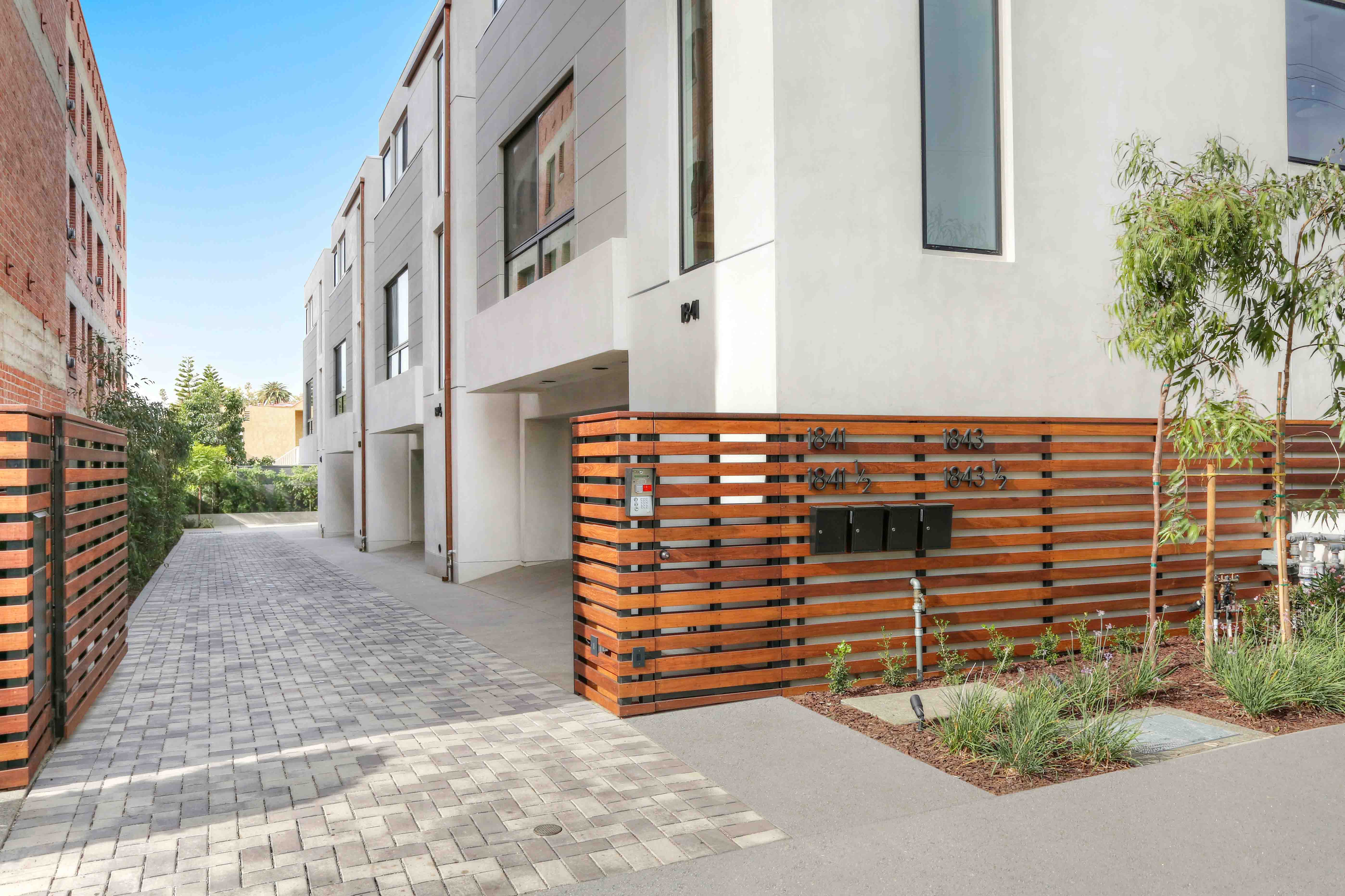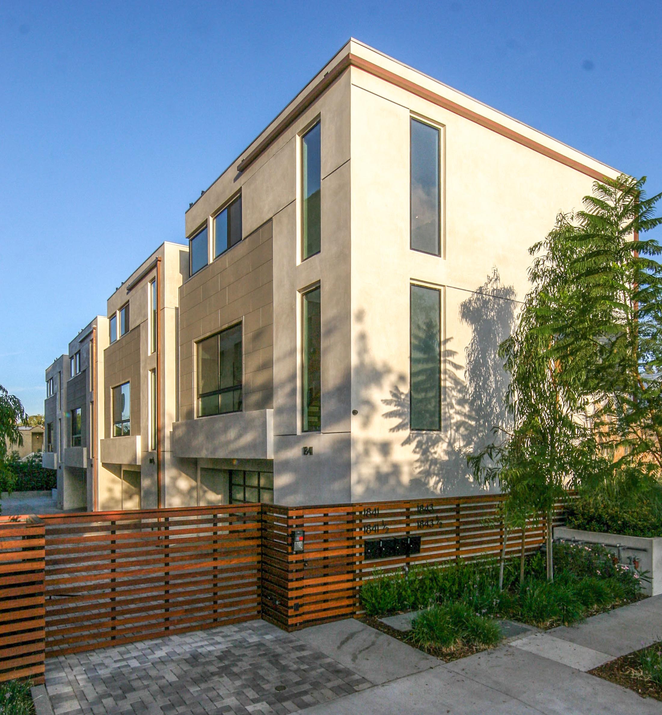 4 Townhomes, vetically split: 3 stories, 1900 sf, 2 car garage, Good views of Griffith Observatory. High Ceilings. The success of this project is a spacious modern livable feeling, even though on compact lots. This is due to a optimizing the lot configuration, use of the adjacent historic 4-story brick wall, careful consideration of views, and dramatic sense of verticality given by the windowed 3-story staircase. Quality finishes, a well thought through floorplan, and nice site work bring the project from a renter's quality aesthetic to owner's quality aesthetic. The careful and comprehensive construction detailing by the architect may not be noticed directly by the end-user, but rather the sense of simple modern elegance will be felt.