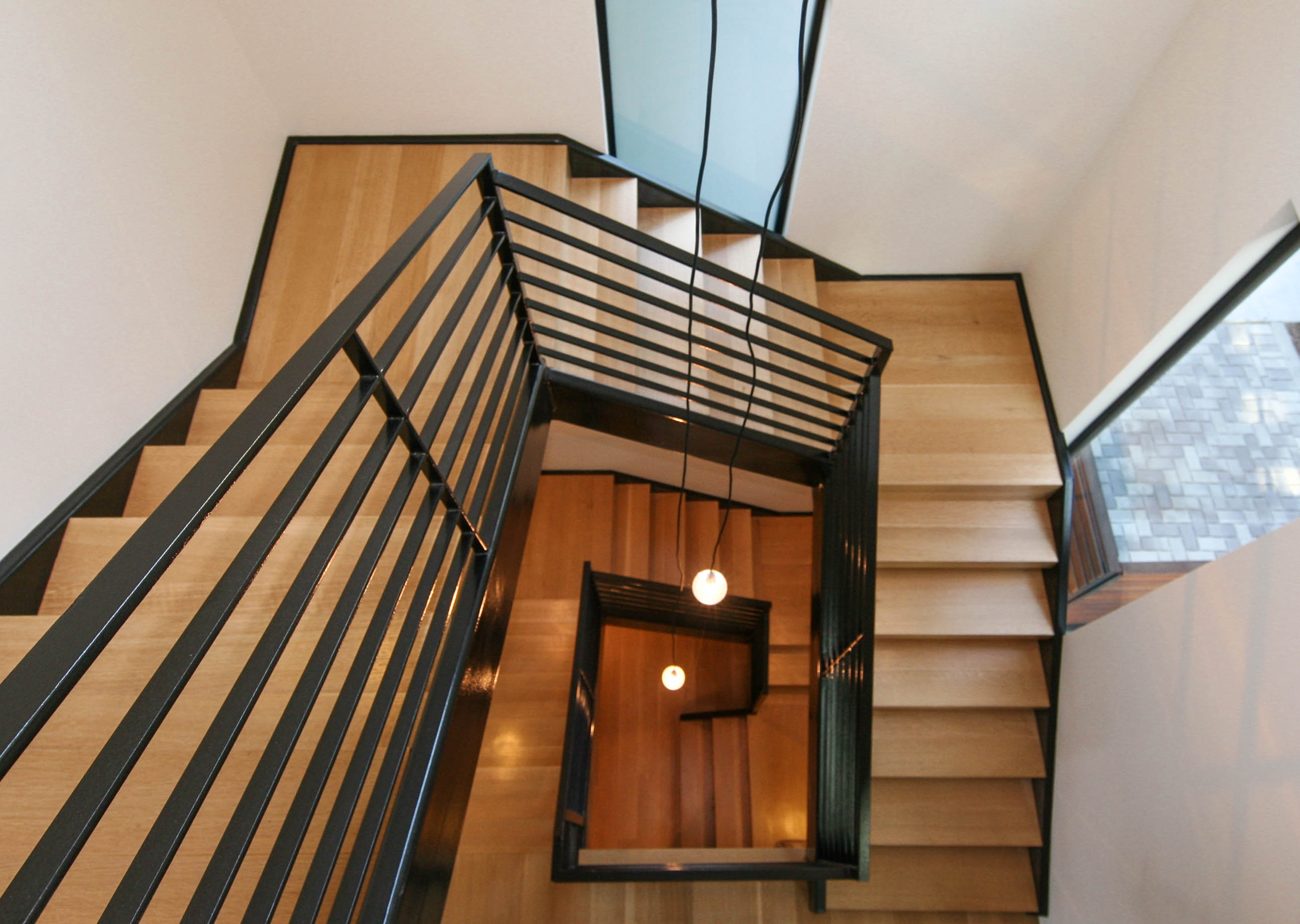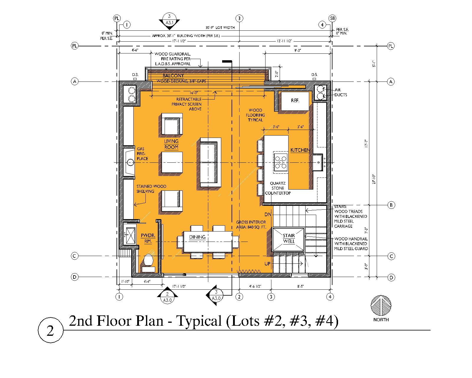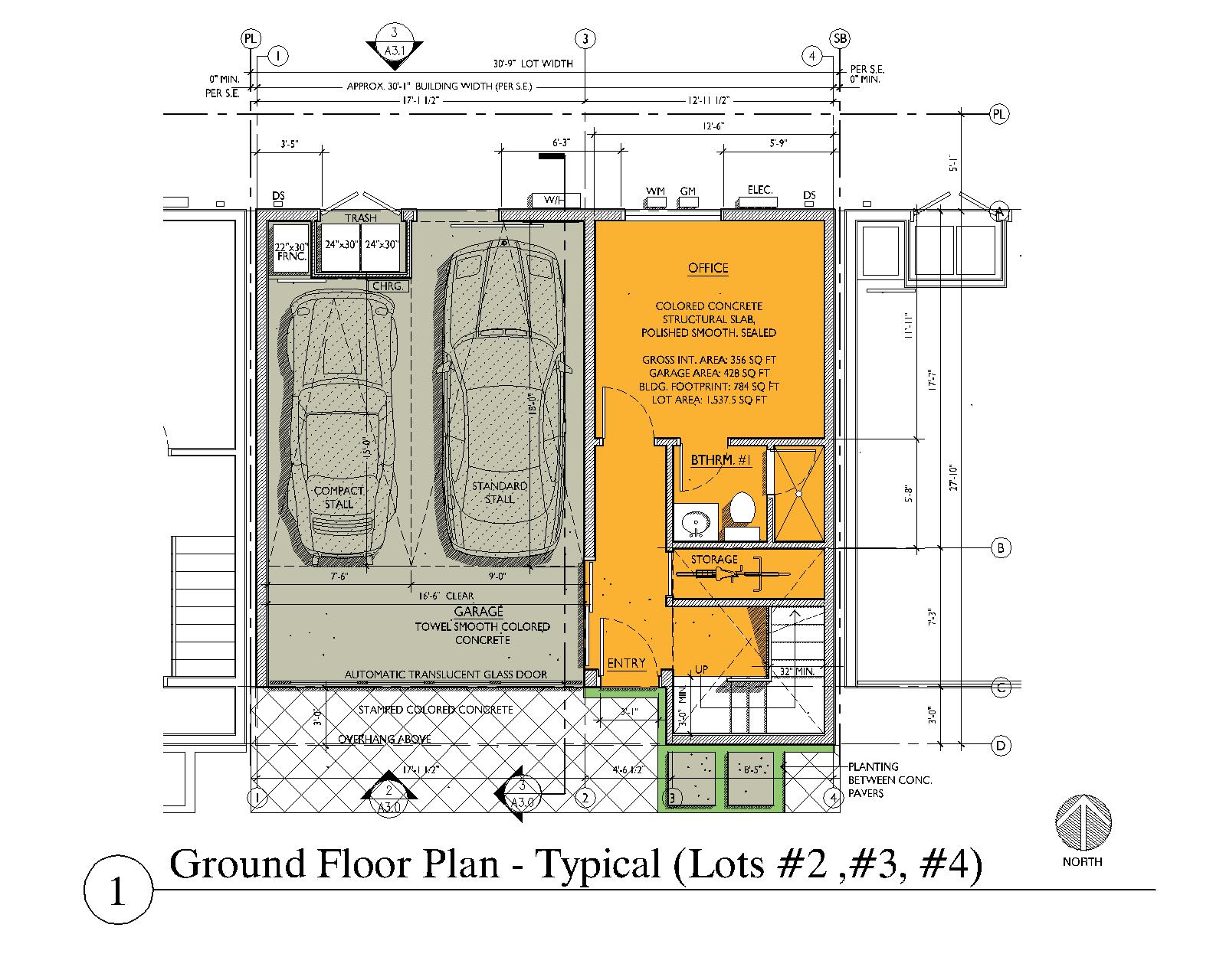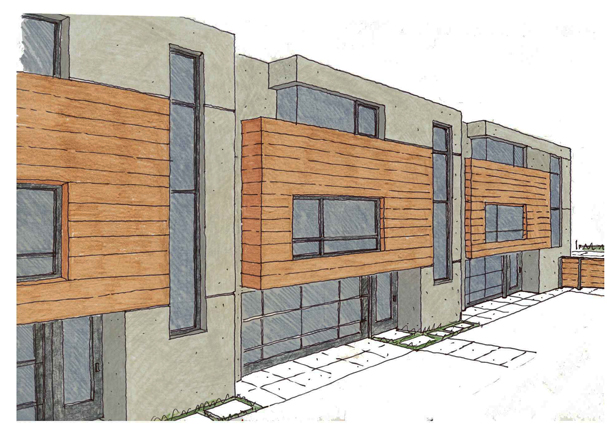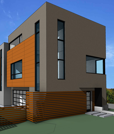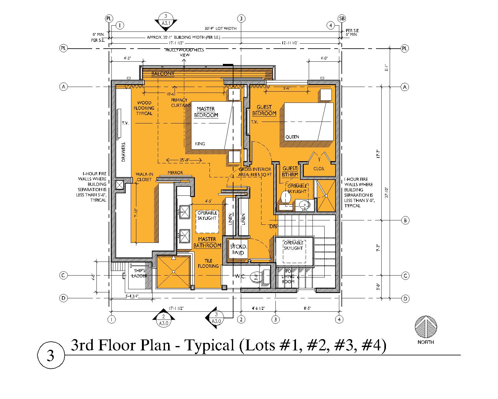 4 Townhomes, vetically split: 3 stories, 1900 sf, 2 car garage, Good views of Griffith Observatory. High Ceilings. The success of this project is a spacious modern livable feeling, even though on compact lots. This is due to a optimizing the lot configuration, use of the adjacent historic 4-story brick wall, careful consideration of views, and dramatic sense of verticality given by the windowed 3-story staircase. Quality finishes, a well thought through floorplan, and nice site work bring the project from a renter's quality aesthetic to owner's quality aesthetic. The careful and comprehensive construction detailing by the architect may not be noticed directly by the end-user, but rather the sense of simple modern elegance will be felt.