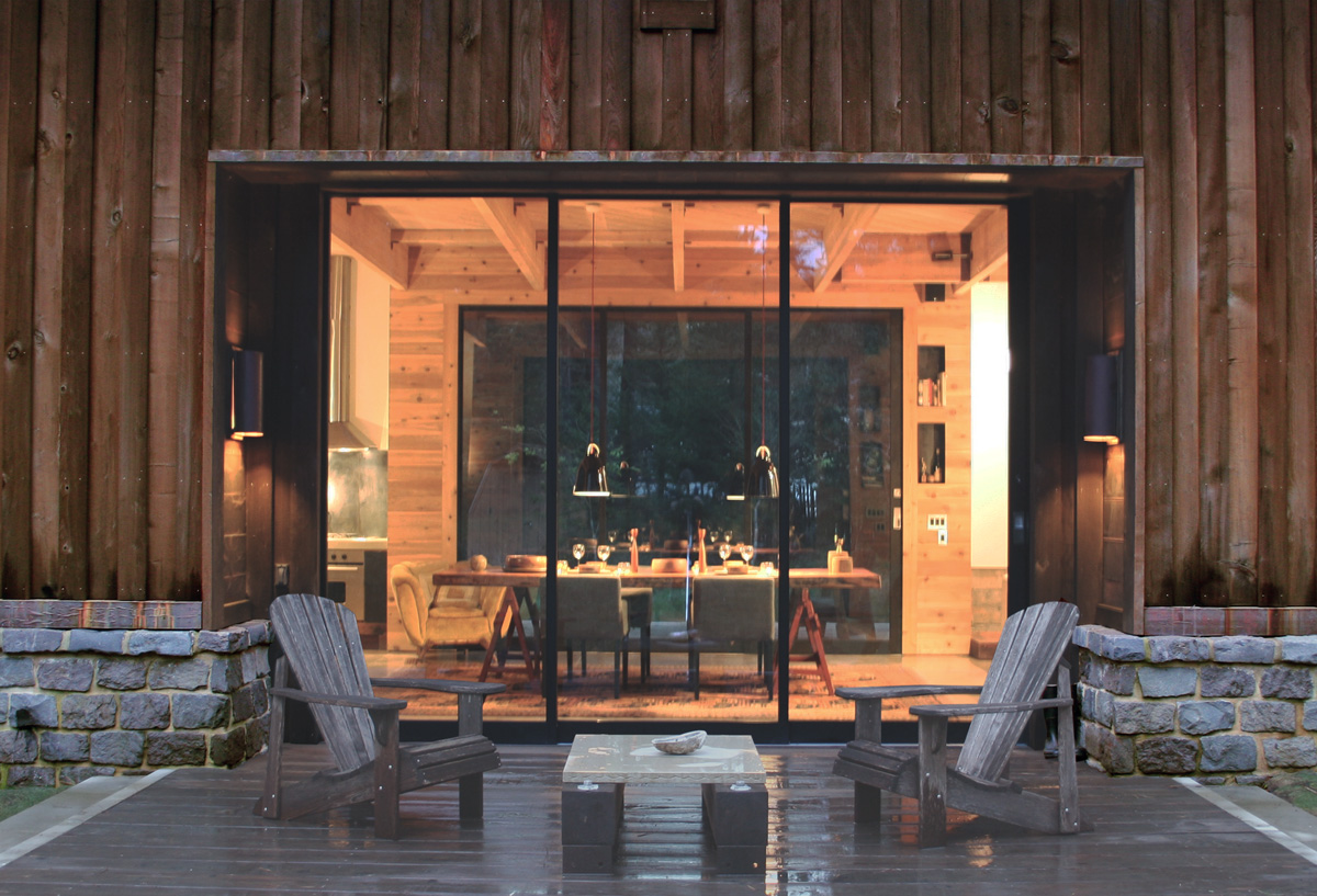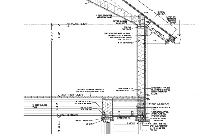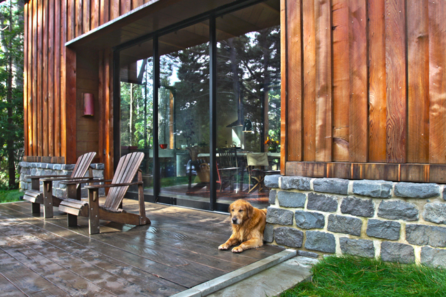 Copper base between stone and redwood. Fleetwood aluminum doors and windows. Corrugated Metal