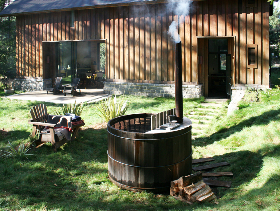 Green-ness: no on-site construction trash collection. Scrap lumber used for wood-burning hot tub. All metal recycled.