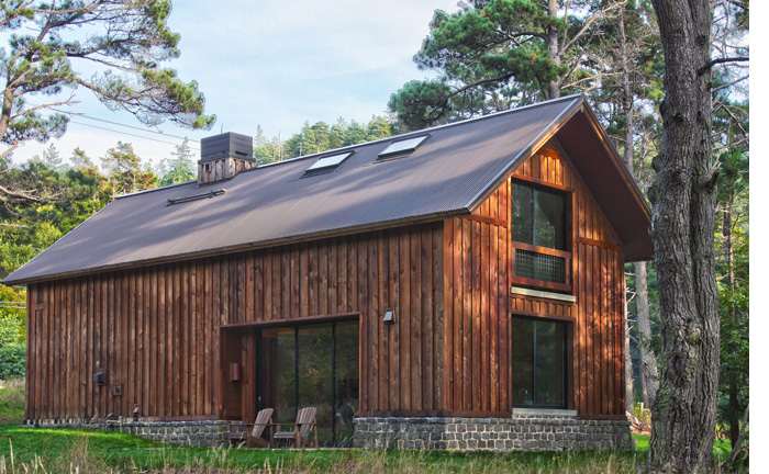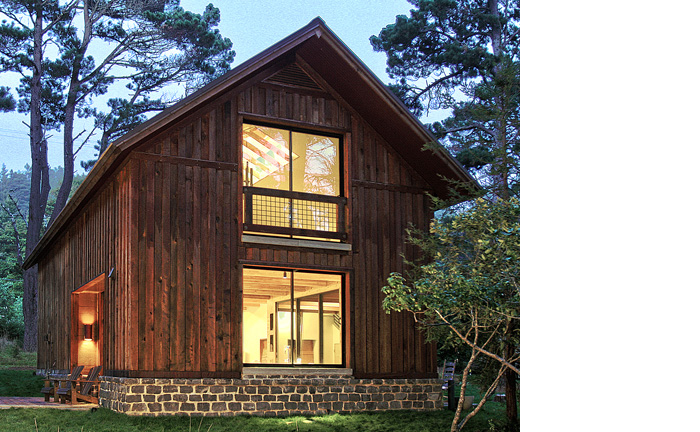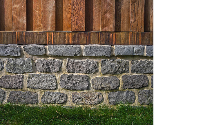 Exterior Materials: San Francisco Cobble Stone Base. Locally milled redwood, 1-1/4" x 5-3/4" battens.